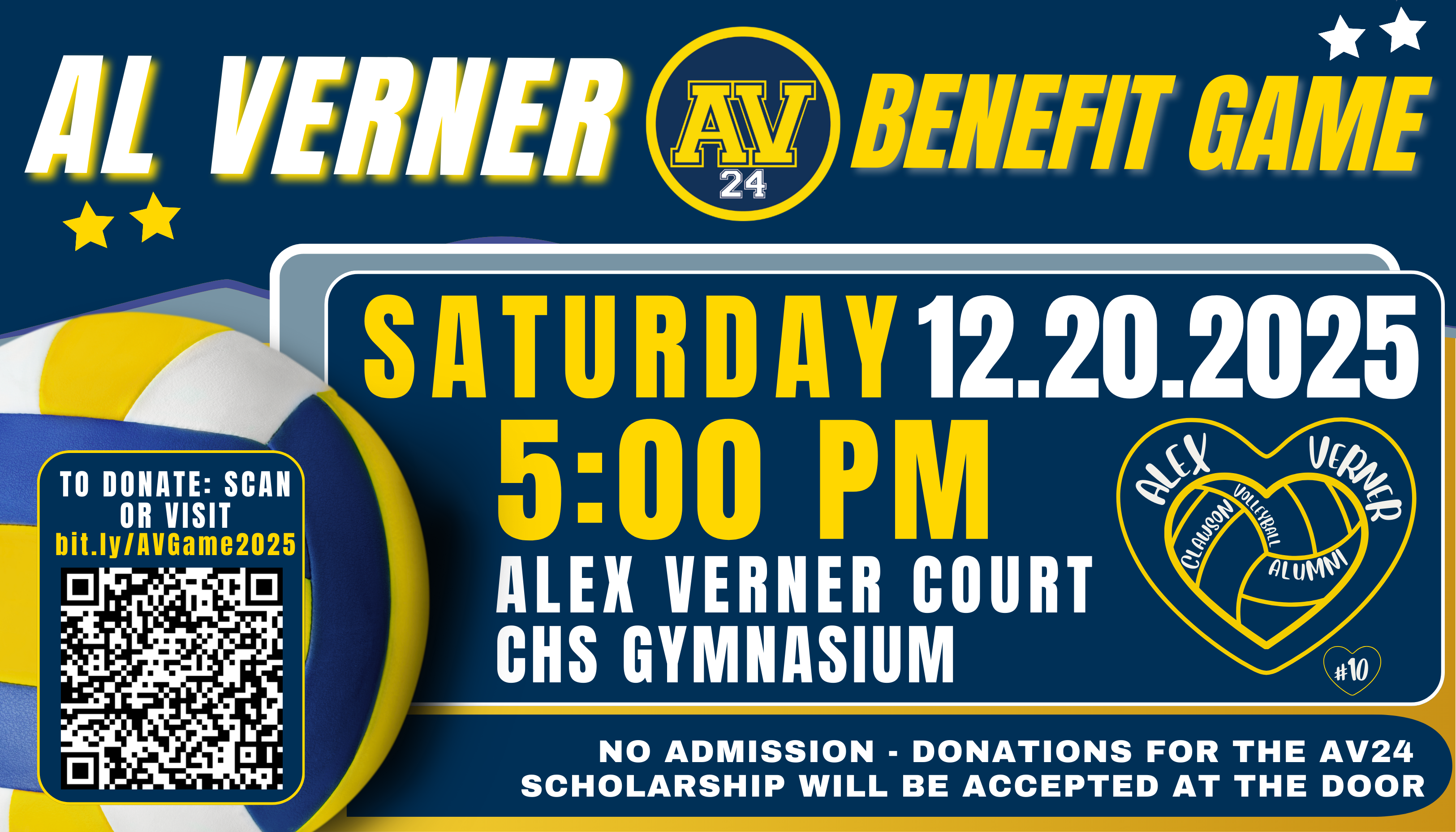 There is no admission fee - donations for the AV24 Scholarship will be accepted at the door or you can donate by visiting bit.ly/AVGame2025. Your support helps keep Alex’s spirit, legacy, and love for volleyball shining bright. πππ #AV24