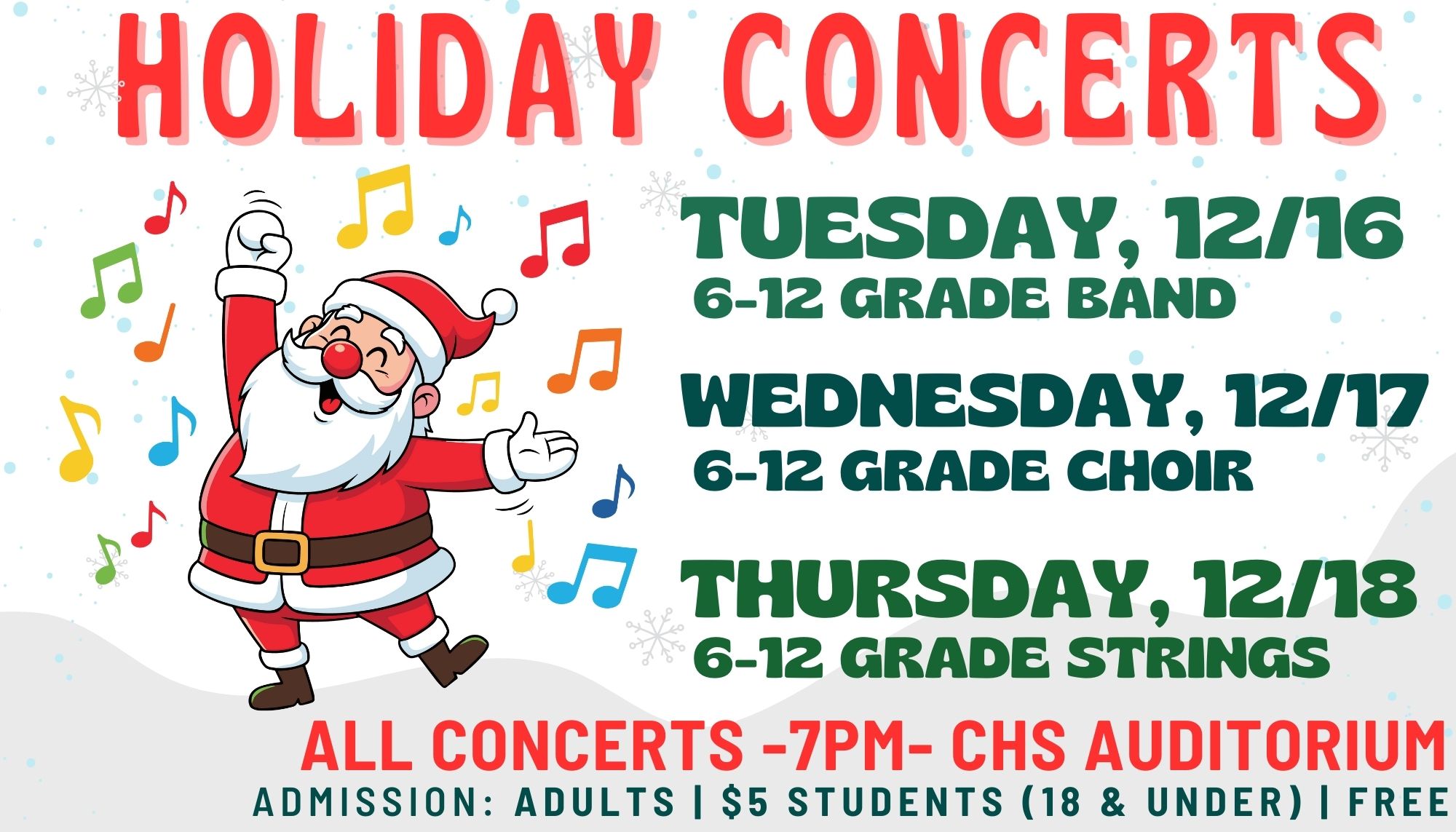 πΆ Join us for our Holiday Concerts this month! Band, Choir, and Strings take the stage Tuesday, Dec. 16th through Thursday, Dec. 18th at 7 PM in the CHS Auditorium!