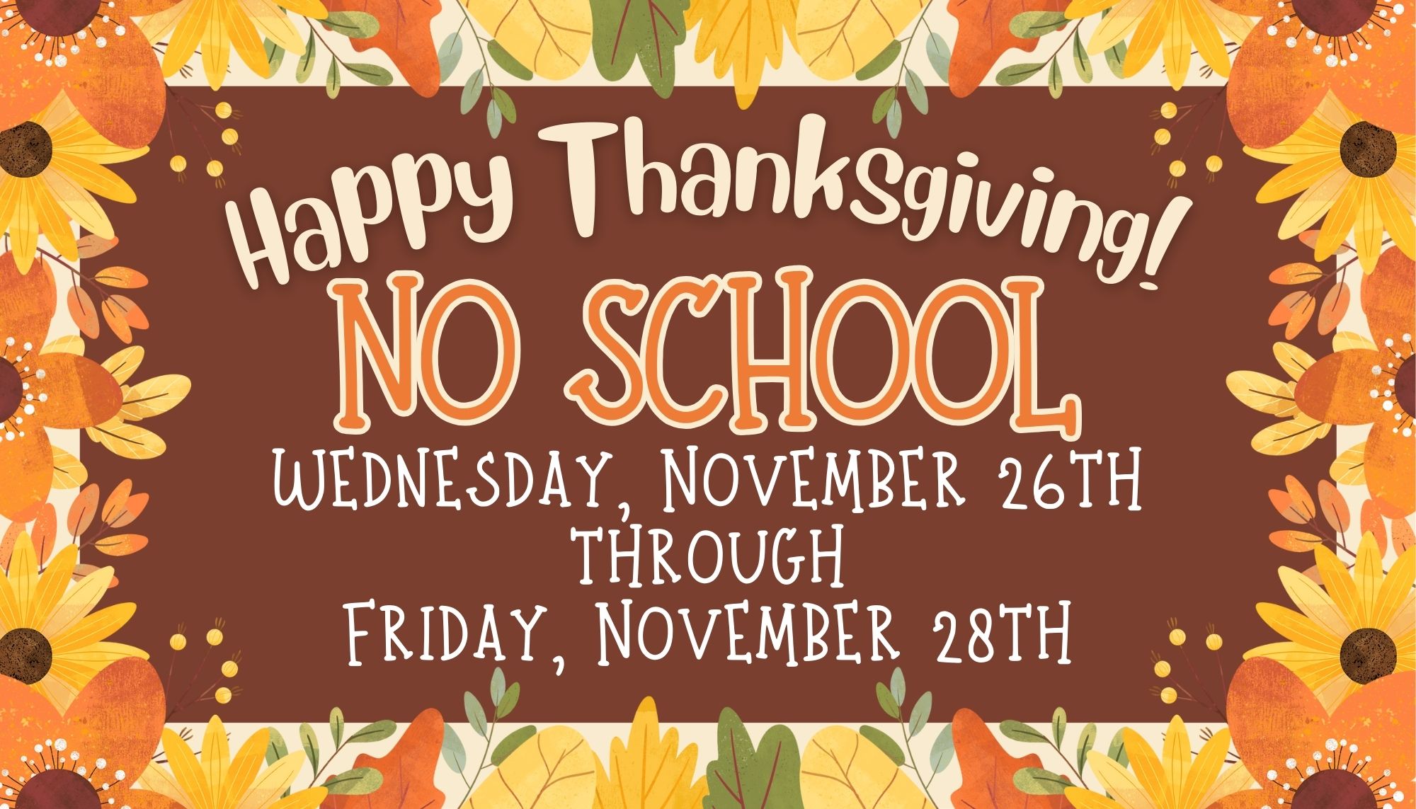 NO SCHOOL – Thanksgiving Recessthru Nov 28NO SCHOOL – Thanksgiving RecessDate: Nov 26 - Nov 28Calendar: District Calendar
